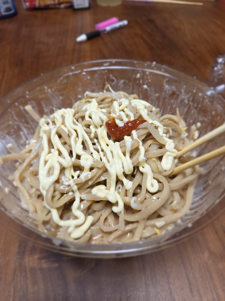 食べ進めるうちに、少し物足りなさを感じたので、追いマヨネーズと練りラー油を追加。